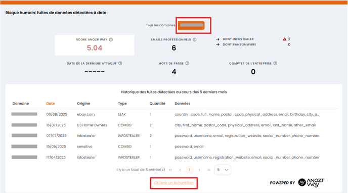 L'échantillon proposé de données (maximum 5 remontées) sur chaque domaine de messagerie est fourni afin de vous donner du contexte et de légitimer l'information que nous vous apportons sous forme d'indicateurs CTI. Il est fourni uniquement lors de Leak de mots de passe et/ou emails. Cette donnée revêt d'une importance particulière de par sa nature de secret.